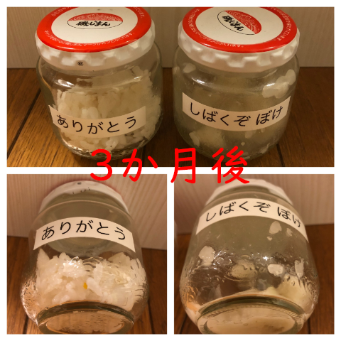 2018年11月から開封しないで3か月「ありがとう」「しばくぞ、ぼけ」と声をかけ、その後1年間同じ環境で声をかけずに放置。