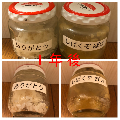 1年後の2019年11月時点で、「ありがとう」はまだ食べれるんちゃうかと思うくらい綺麗なままで、「しばくぞ、ぼけ」はドロドロに溶けてカビ入りの黄色い液体になってん。