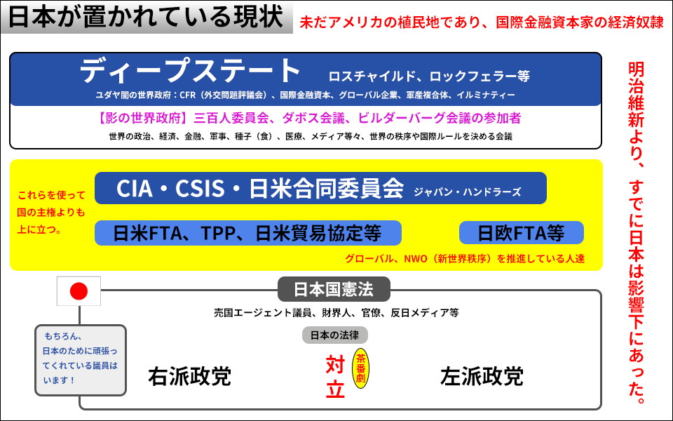 世界の上級支配層が決めた会議の内容が、日米FTA、日欧FTA、TPP等の国際協定に反映され、日本の憲法よりもそれらの協定が優先されているん現状なんや。